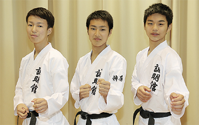 出場選手は、剛柔流空手道誠心明智会「誠明館」に所属する、赤坂風太さん(3年)、石合尊貴さん(同)、防村(よけむら)修司さん(同)の3人。競技はトーナメント制で、5人の審判によるフラッグ判定。形の同時性やスピード・瞬発力などのアスリート性が求められた。3人は「優勝を狙っていたのでうれしかった」と振り返る。