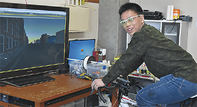 沓澤さんの所属する山崎研究室では、「雰囲気」をテーマに研究をしている。沓澤さんは昨年4月から、(株)なまえめがねと共同で「雰囲気メガネ」の研究を開始。自身も、毎日座間市の自宅から大学まで、片道10Kmの道のりをロードバイクで通うほど自転車好きなこともあり、メガネを題材にしたという。同メガネは、自転車走行時の走行感や危険を可視化するもの。開発にあたり、「速度の表示方法を工夫した」と言い、「あえて速すぎる=赤、普通=緑、遅い=黄と単純な色にすることでわかりやすくした」と話した。