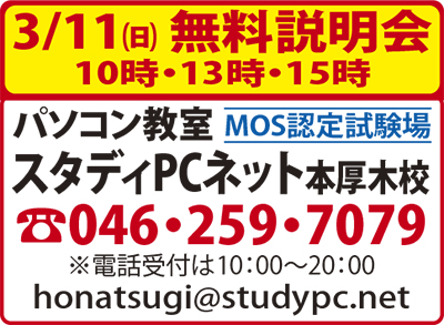 主婦やシニア、OL、学生に人気の本厚木駅北口「パソコン教室・スタディPCネット」が、快適に勉強できる空間にリニューアル。初心者から、資格取得を目指す人まで個別指導とオンデマンド学習を組み合わせて上達が可能な同校。1時間950円〜の月謝のみ(テキスト代別途)で好きな時間や曜日に習いたい事だけを学べる。資格取得で就職を有利にしたい、パソコンスキルを仕事に活かしたい人は随時受付中の無料体験へ。先着で3大特典あり。また2020年の小中学校でのプログラミング教育必修化に向けたロボットプログラミング講座も開講。キッズ、シニア、教職員もOK。詳細は左記へ。