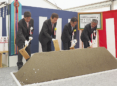 この日の式典には、柳田理事長をはじめ、小林常良厚木市長、難波達哉厚木市議会議長、工事を請け負う特定業務代行者の(株)フジタや共同企業体の(株)小島組の関係者なども出席。工事が事故なく安全に完了することを願い、くわ入れなどを行った。