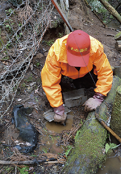 わなを仕掛けるのは、厚木市が上荻野地区〜玉川地区間約25Kmにわたり設置している、獣害防護柵から人里側。わな部会員は、シカやイノシシが通る「けもの道」を探して深さ10cmほどの穴を掘り、くくりわなを埋め戻す。設置後は、誤って人が踏まないよう、わなを仕掛けていることを知らせる札で周知し、毎日確認に向かう。