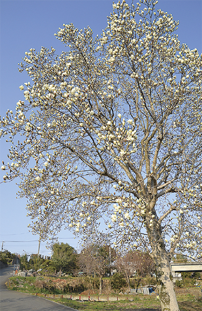 市内中荻野の広町公園駐車場脇に立つ白木蓮が見ごろを迎えている。