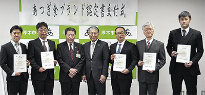 あつぎ食ブランド「厚木OEC(おいしい)フード」の認定式が3月8日、厚木市役所で行われ、5事業者が出席し認定証を交付された=写真。