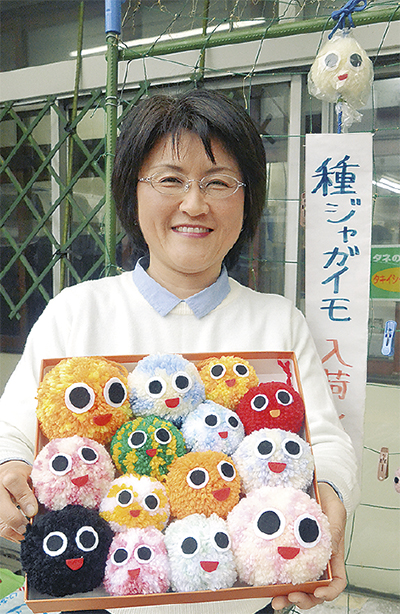 東町郵便局交差点そばで信号を待つ間、ふと目に入ったまん丸の人形。色とりどりの毛糸のボールの正体は、岩崎種苗(株)(厚木町5の11)に勤務する須澤幸子さん=写真=お手製の「タネじゃが君」。3年ほど前から、春先に種ジャガイモが入荷すると店頭に吊るし、道行く人にPRしている。