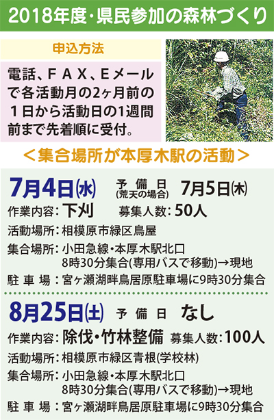 (公財)かながわトラストみどり財団では、2018年度「県民参加の森林づくり」の日程表を配布している。県内各所の森林や緑地で、5月から1月までで全20回。午前8時30分に指定された小田急線やJR東海道線の駅前に集合し、現地までは専用バスでの移動になる。作業内容は植栽、下刈、除伐、竹林整備など。昼食持参。「森林づくり」への参加方法や詳細はホームページで確認できる。県内全域の日程表は同財団に連絡すると郵便で送ってくれる。豊かな自然を感じながら、森林づくり活動に参加してみては。