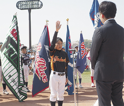 杉田社長は「仲間を信じ、友情を深め、正々堂々と力いっぱいのプレーができるよう頑張ってください」と選手にエールをおくり、県央ヤンチャーズの主将・岡本貫太さんは「感謝の気持ちをプレーに込め、もっと上手くなるために”トライ”を合言葉に感動を与えられるような大会にします」と元気よく選手宣誓を行った=写真。