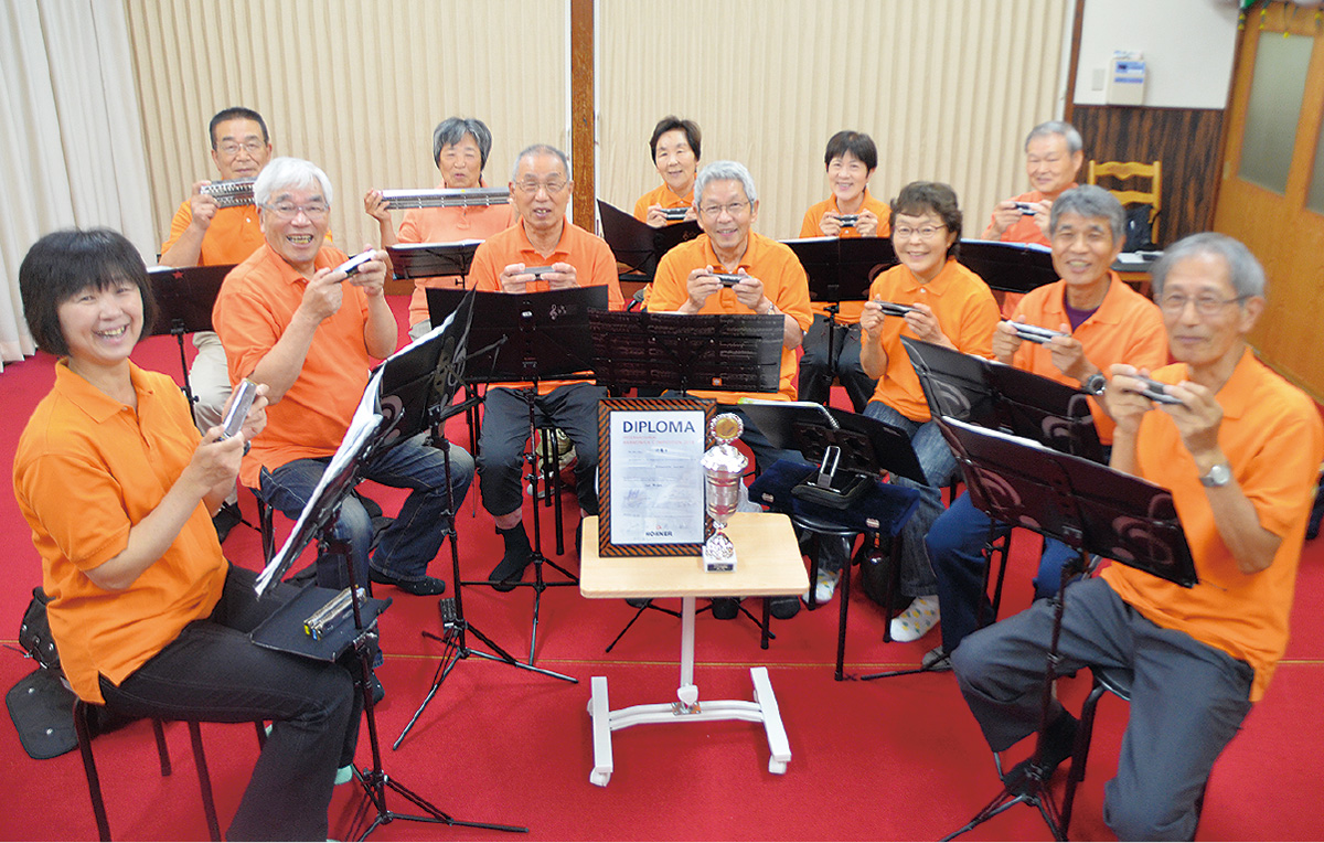 同グループは12人から成り、複音ハーモニカ・バリトンハーモニカ・バスハーモニカ・コードハーモニカの4種で音色を奏でる。メンバーは50代から80代で平均年齢は70代半ば。「みんなで気持ちを揃えて吹くのが良い。歳をとっている暇がないよ」と笑い、若手も「元気の秘訣を教わっている」と尊敬し合う仲だ。