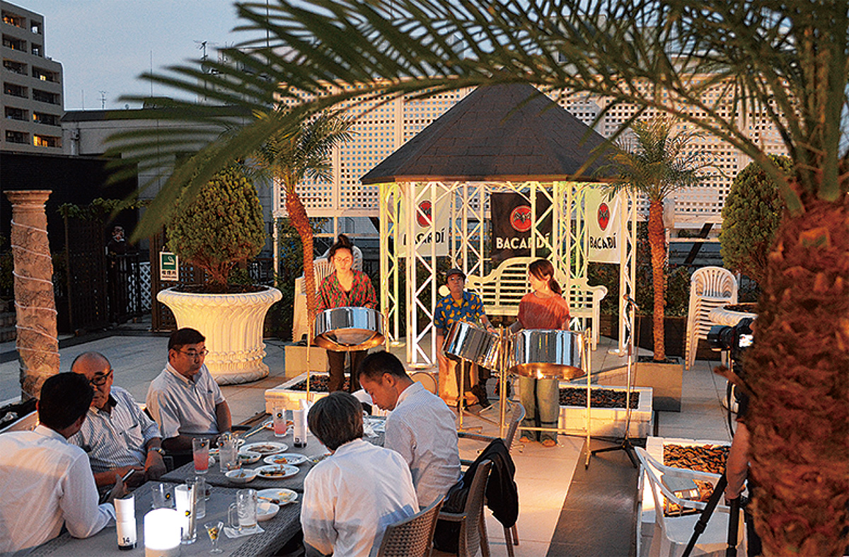 22日にはメディア向けにレセプションが行われた。来場者はビールやモヒートを手に、フラやスティールパンの演奏に酔いしれた=写真。