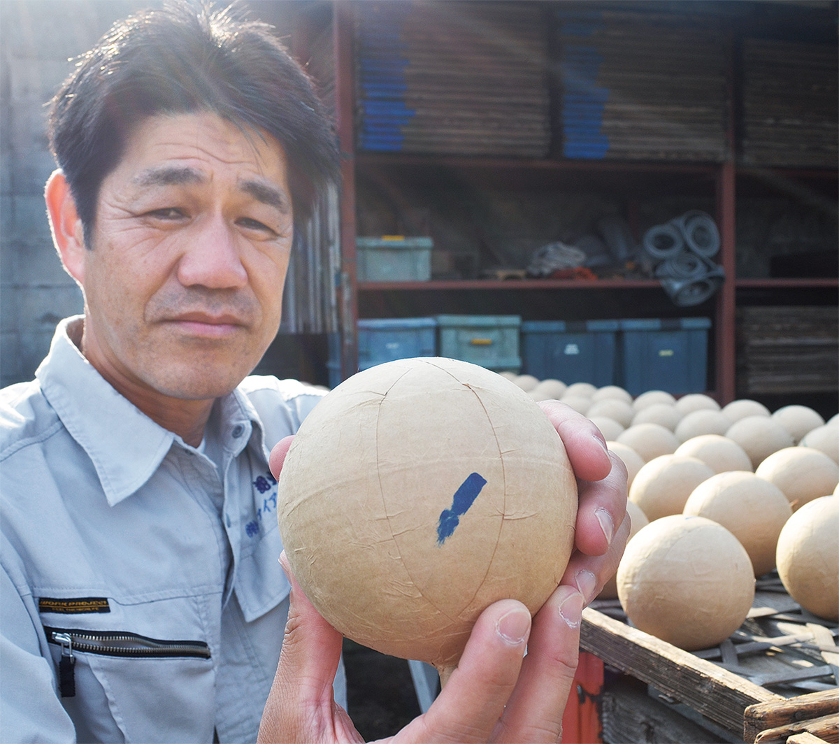 年間を通して約1万8000発を製造し、県内各地で花火を上げる同社。敷地内には、大小さまざまな花火がずらり。現在、梅雨の晴れ間に「日乾」と呼ばれる、花火を天日で干して乾燥させる作業を行う。花火づくりの作業は大きく、【1】薬品を調合して火薬を作る【2】火薬を粒状にする「星掛け」【3】粒や玉状にした火薬を詰める「玉込め」【4】補強のために紙を何重にも貼っていく「玉貼り」に分かれる。作り置いた花火を乾燥させると同時に、「玉貼り」の作業も進んでいる。