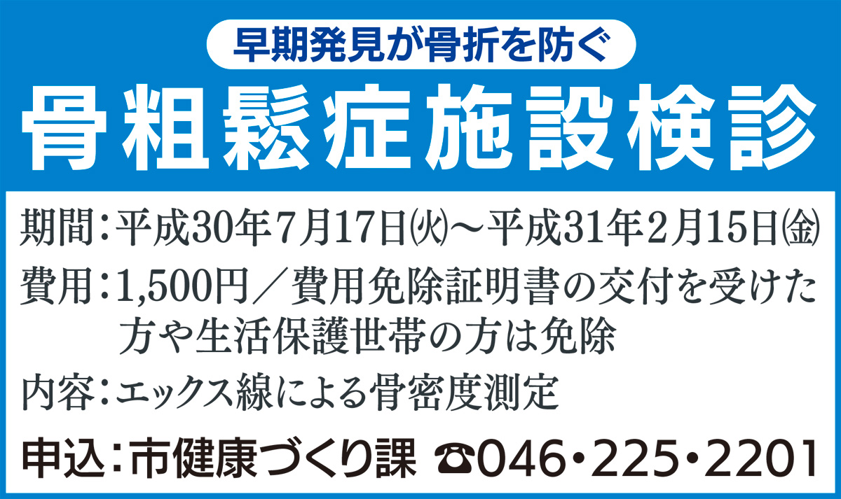 厚木市では今年度から、骨粗鬆症集団検診に加え、病院でも骨密度検診を受けられるようになりました。対象者は厚木市内在住の女性で、今年度40歳、45歳、50歳、55歳、60歳、65歳、70歳になる方です=表参照。費用は1500円です。X線で左手を撮影して測定します。実施期間は、平成30年7月17日(火)から平成31年2月15日(金)までです。厚木市健康づくり課へ電話でお申込みください(【電話】046・225・2201)。