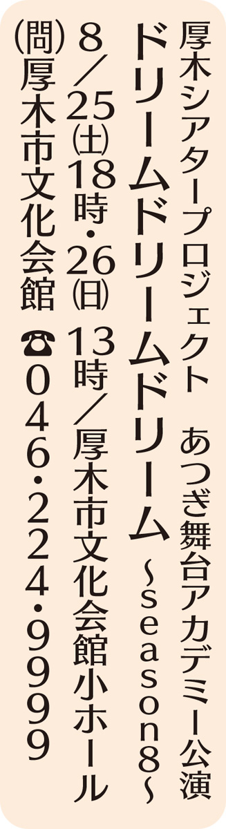 今回は私が文化会館で育成している子供たち(小4〜中2)。あつぎ舞台アカデミーの本公演『ドリームドリームドリーム』のお知らせです。