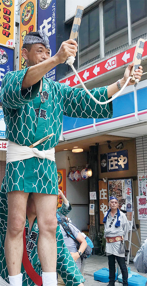 ▽緑地に網目文、厚木神社神輿保存會・厚神會の『會長』の二文字が胸元に入った半纏。頭に巻いた手拭いはいつだって、角がピンと立った喧嘩縛り。「馬の上に立つと目立つからね」と、厚木神社例大祭では毎年足袋を新調するこだわり。締め込み(褌)を巻くと「やっぱり気合が入るねぇ」とにやり。今年も7月に行われた厚木神社例大祭では約40人の會員や、遠くは東京や千葉からも担ぎに来る26の協力団体など、約130人が「怪我やトラブルのないよう、良い渡御ができるよう」取り仕切った。「猛暑の中、みんなよく頑張ってくれた。毎年担ぎ手だけでなく、協力してくれる自治会や飲食店など、頭が上がらないよ」。
