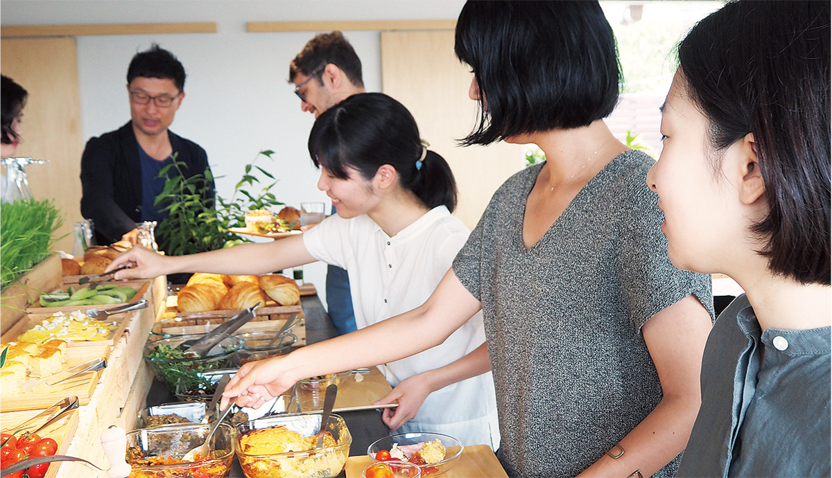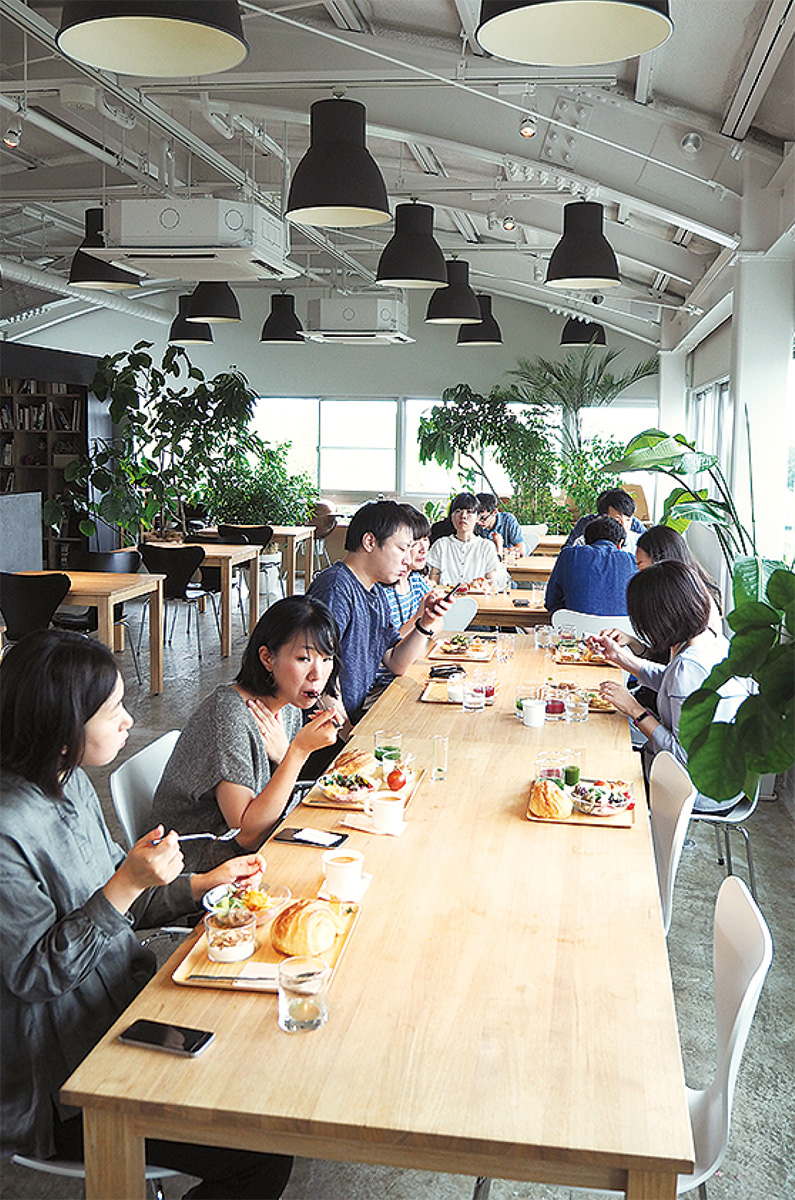 従来の設計事務所といえば、仕事は深夜に及ぶのが当たり前。しかしこれからの働き方は多様性をもたなくてはならない。「まずは早く帰る」「変えるためには朝シフトへ」と社長の日比野拓さん(=写真中央/レストランテラスで)は考えた。早朝勤務のメリットを感じてもらい、一日の仕事効率を上げるためにも「栄養価の高い朝食を提供しよう」と、専門のシェフも採用する徹底ぶりだ。
