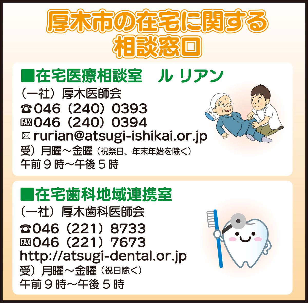 また、(一社)厚木歯科医師会では、歯科医院に通院できない人の相談窓口として、在宅歯科地域連携室を運営する。