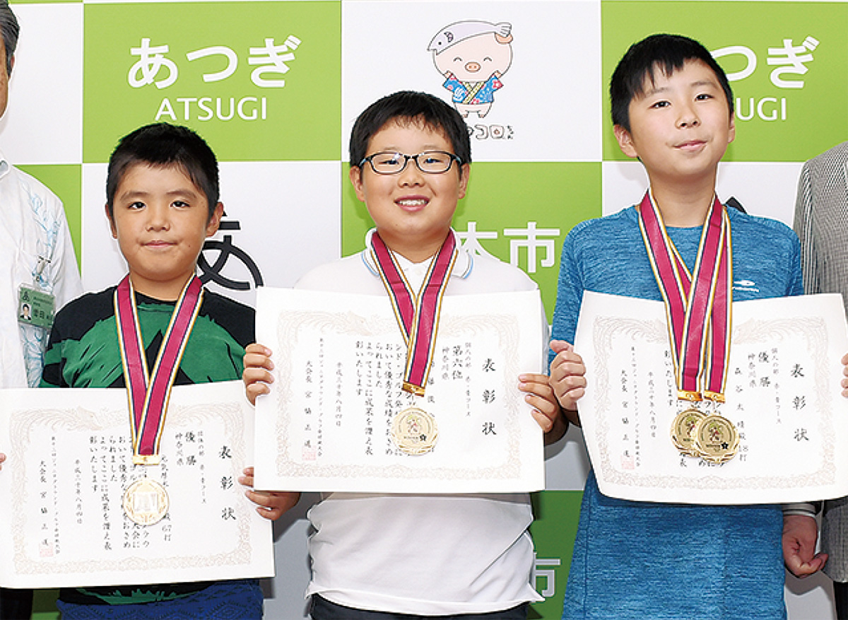沖縄や大阪など8府県から105人が出場したこの大会。厚木市グラウンド・ゴルフ協会会員の内藤俊介君(南毛利小6年)、森谷太晴(たいせい)君(上荻野小6年)、廣木慎吾君(上荻野小5年)の3人は団体の部で優勝、森谷君は個人の部でも1位に輝いた。8月10日にはメダルと賞状を持参し、小林常良厚木市長に優勝を報告した=写真。