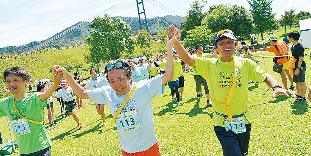 「医師自らが健康の大切さを広めよう」と3年前から参加している「宮ヶ瀬湖24時間リレーマラソン」に今年も厚木医師会チームが出場した。開業医、厚木市立病院、東名厚木病院、湘南厚木病院の医師・医療スタッフらが3チームに分かれてエントリーし、24時間たすきを繋いで見事完走を果たした=写真。