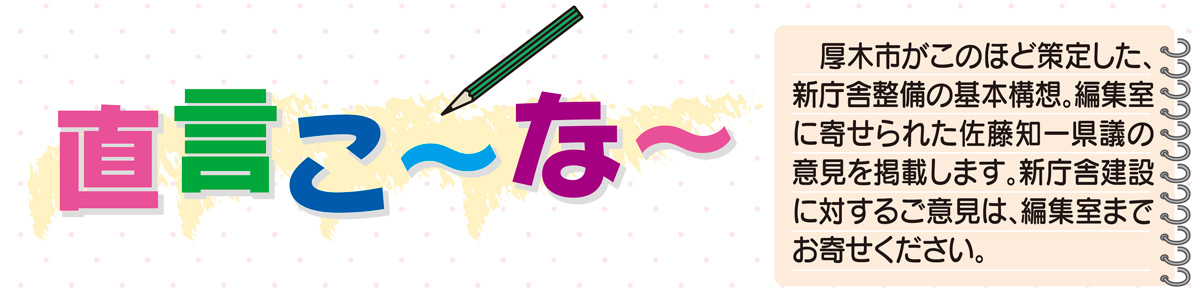 一方、市整備事業には、県予算も関係し、厚木市新庁舎整備について、県施設の合築整備を求められていることから、地元の県議として意見します。