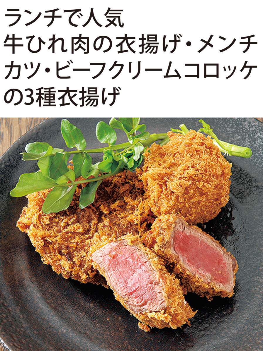 厳選した牛肉、魚介、新鮮な野菜を丁寧に調理し、ランチは週替わりメニューが1000円、定番の三種衣揚げは1800円で楽しめる。アラカルトもあるディナータイムは、もちろんコースも充実。ワインを含むドリンクも豊富にそろう。