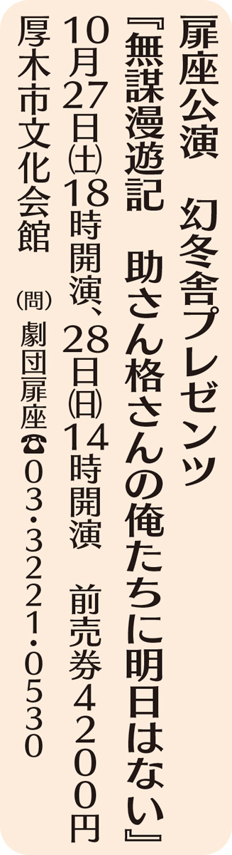 しかし、六角精児を知っていても、扉座を知らないと言う人が厚木にも大勢いて、その現状を知るたびに演劇というジャンルの弱さを痛感します。ここ数年、六角は劇団以外の活動が派手で、そちらが目立ちがちなんですが、変わらず劇団員です。若い頃に私から借りた金の返済が終わらなくて、ずっと年季が明けずにいるのです。元金は今の彼なら、簡単に返せる金額でした。それが利息が膨らみ過ぎてもはや返済不能となっています。