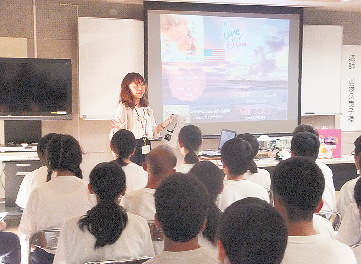 厚木市出身で米国フロリダ州在住の加藤久美子さん(39)が9月18日、母校の東名中学校を訪れ、「夢は絶対叶う!」をテーマに講演した。