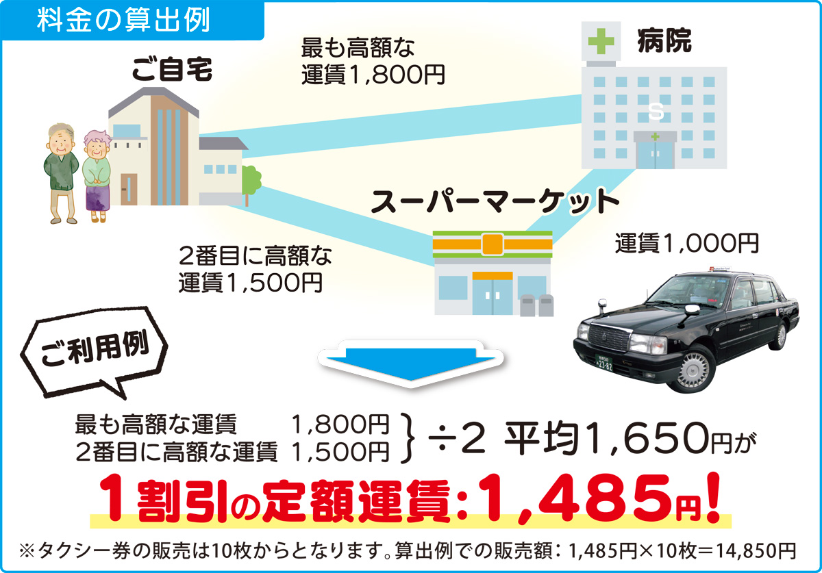 これは、自宅のほか、病院やスーパー、駅など、あらかじめ指定した目的地2カ所を登録し、その間のタクシー移動を定額運賃で利用できるというもの。基準となる運賃は、標準的な走行状態を想定して算出される各目的地間の運賃額をもとに、高額上位2区間の平均額を設定。そこから、さらに1割引きされる=図参照。