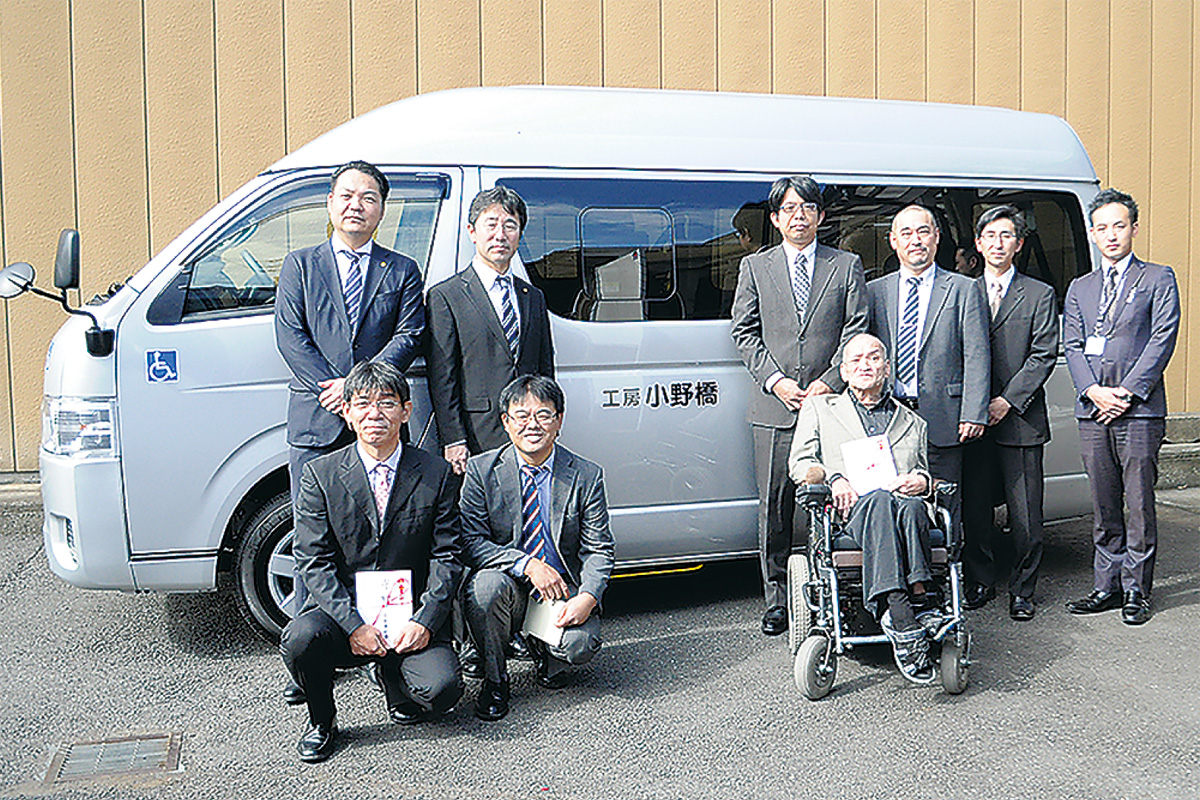 武部鉄工所労働組合(小松克生執行委員長=人物風土記で紹介)は、組合員から募った寄付で市内の障害者施設に自動車を寄贈。11月3日にその寄贈式が行われた=写真。