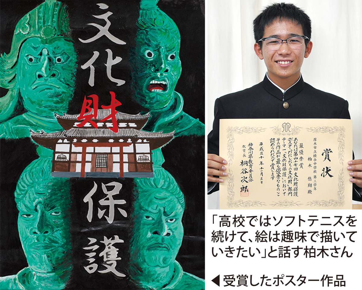 神奈川県の中学生を対象に行われた「第47回文化財保護ポスター事業」の入賞作品がこのほど発表された。応募総数851点(69校)の中から、「わたしたちの文化財」部門で柏木悠翔(ゆうと)さん(睦合中3年)=写真=が、最優秀賞に輝いた。