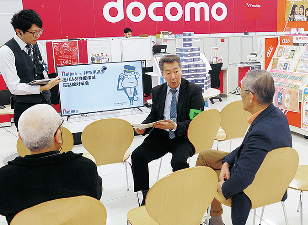 この対策会は、振込め詐欺のほとんどが電話から始まることを受け、ノジマと神奈川県警が被害を撲滅するために企画したもの。当日は、来店客に厚木署生活安全第一課長の長崎達警部が、「相手は声を残すのを嫌がるから、留守番電話の設定にするのは効果的。知人だったら、わかった時点で通話することもできる」など予防策を伝えた。