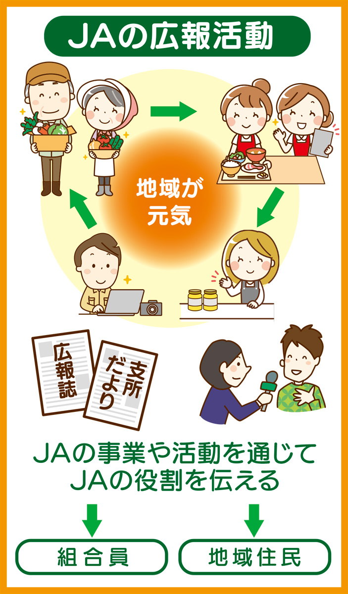 JAの広報活動には二つの目的があります。一つは、組合員にJAの事業や活動を知らせること。もう一つは、地域の皆さんにJAの取り組みや果たしている役割を知ってもらうことです。
