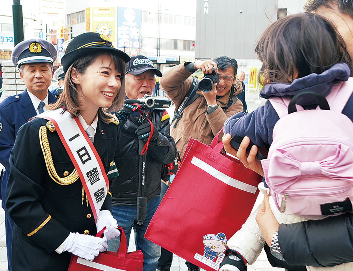 当日は、TBSアナウンサーの皆川玲奈さんを一日署長に委嘱。本厚木駅前で啓発活動を行い=写真=、「年末はお酒の席も多く事故も多い。改めて交通マナーを見直して」と呼びかけた。市交通安全母の会連絡協議会員の先導するパレードに同行し、厚木一番街などで飲酒運転防止や交通ルール順守を訴えた。清水昭人警察署長は「無事故で年末、笑顔で新年を迎えられるよう、事故のない日を目指して皆さんと頑張っていきたい」と話した。