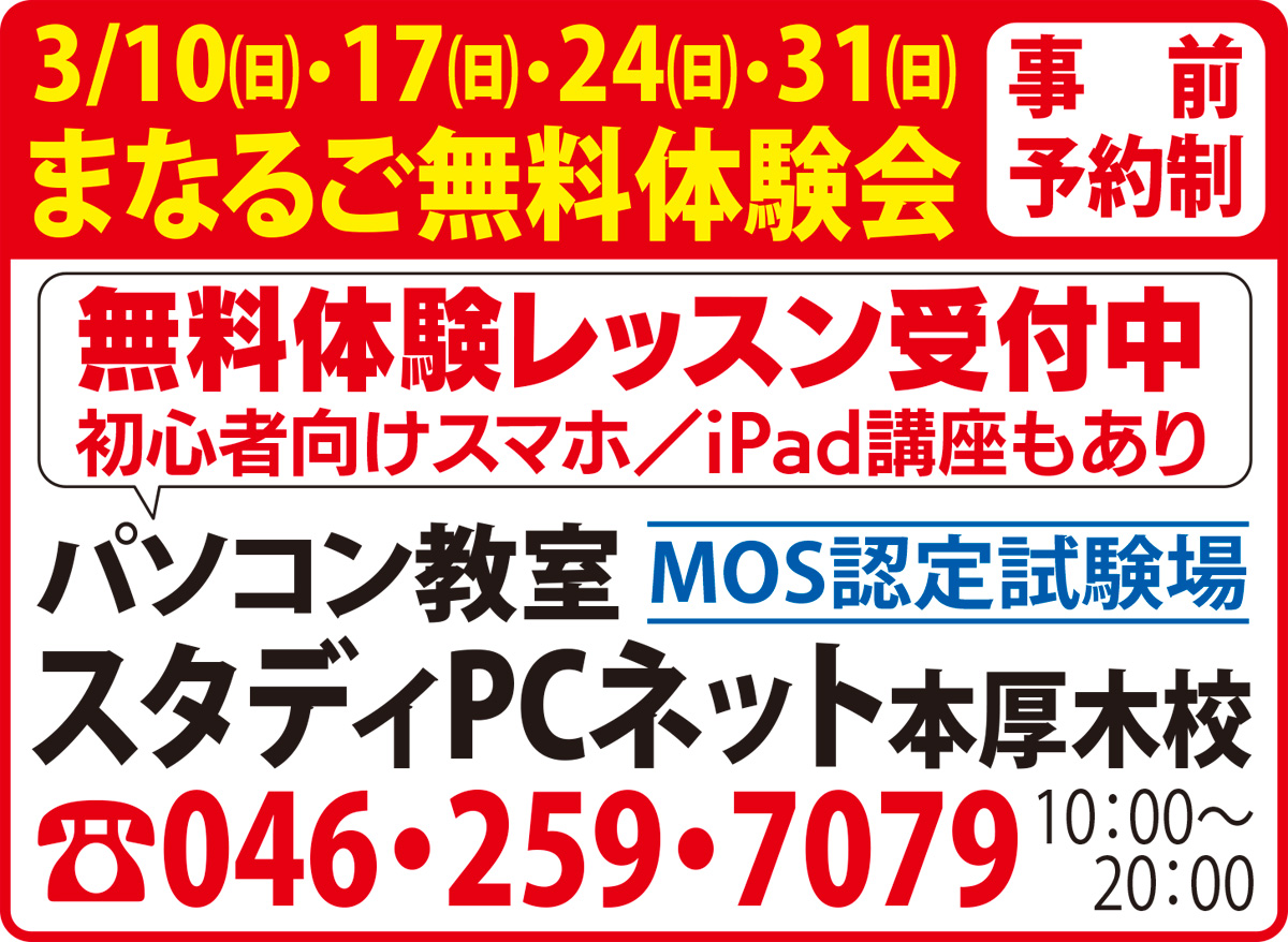 スタディPCネット本厚木校は、論理的思考力や創造力、問題解決力を養うプログラミングを効率良く学べる講座を4月に開講。小中学生向けの学習教材「まなるご」を使い、パソコン操作やIT基礎スキルまで、これからのIT社会に欠かせない知識を楽しみながら身に付けられるという。費用は月3時間5千円(テキスト代別)で、3月の毎週日曜日に無料体験会を開く。