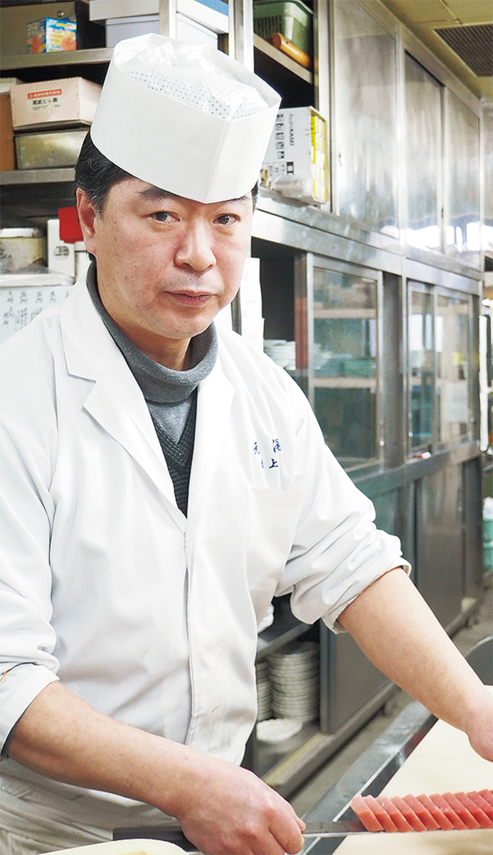 この道35年。中学を卒業後、15歳で料理人をめざし、地元飯山の元湯旅館に入社。同旅館の厨房を長年仕切っている齊藤健次調理顧問に”料理道”をイチから仕込まれた。その後、市外や県外の他の厨房も経験するが、地元へ戻り、現在、元湯旅館の調理長を務める。「洗い方から始めていろいろあったけれど、やめたいと思ったことはない」ときっぱり。「若いころから筋がよかった」と齊藤さんは目を細める。