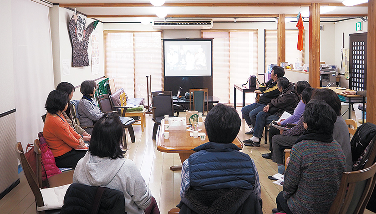 市内戸室の民間福祉施設「みどりの丘」で定期的に開催されている若年性認知症カフェ「そらとうみとたいようと」の会。8回目のカフェが2月16日に開かれ、若年性認知症の当事者とその家族が集った。当日、当事者は認知症精通スタッフによるレクリエーション活動などに参加し、その間、家族や支援者らは情報交換を行った=写真。