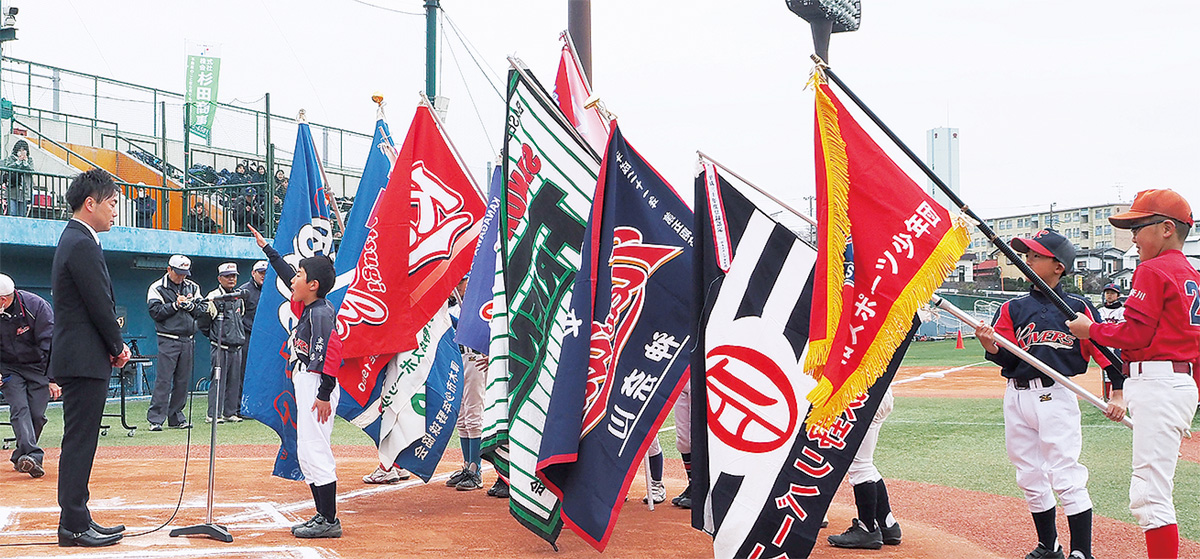 その後、参加12チームが団旗を掲げる中、荻野リバースの松野春平主将が「一緒にがんばってきた仲間とともに楽しく元気よくプレーします」と堂々と選手宣誓を行い=写真=、会場からは大きな拍手が巻き起こった。