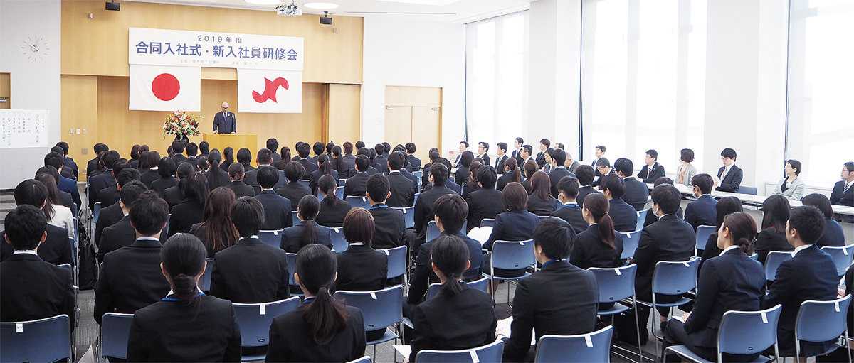 この合同入社式は今年で35回目。式典当日と翌日の2日間にわたり、ビジネスマナー研修や情報セキュリティ対策講座などを学ぶ新入社員研修会も同時に実施された。