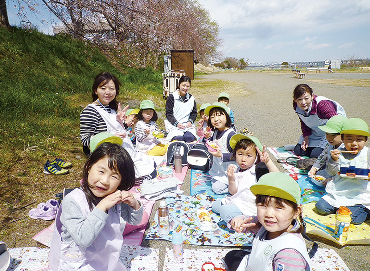 4月の晴れた平日。「おいしいね」「桜きれいだね」という声が、旭町の健康ひろばの近くから聞こえていた。同会では季節ごとに行われる行事を大切にしており、「キンダーガーデンこばと」のお友達が花見をしていた。桜の花を眺めながら食べる弁当に子どもたちも満面の笑みを見せており、時折ひらひらと舞い降りる花びらを指さしながら楽しんでいた。