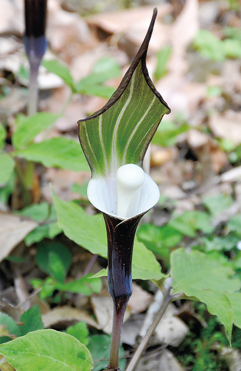 サトイモ科テンナンショウ属のユキモチソウ。マムシグサのように笠をかぶった形と、白い餅のようなものが中央にあるのが特徴。和歌山、三重など本州の西側や四国で見られるため、「県内で見れるのは珍しいのでは」と同園では話す。