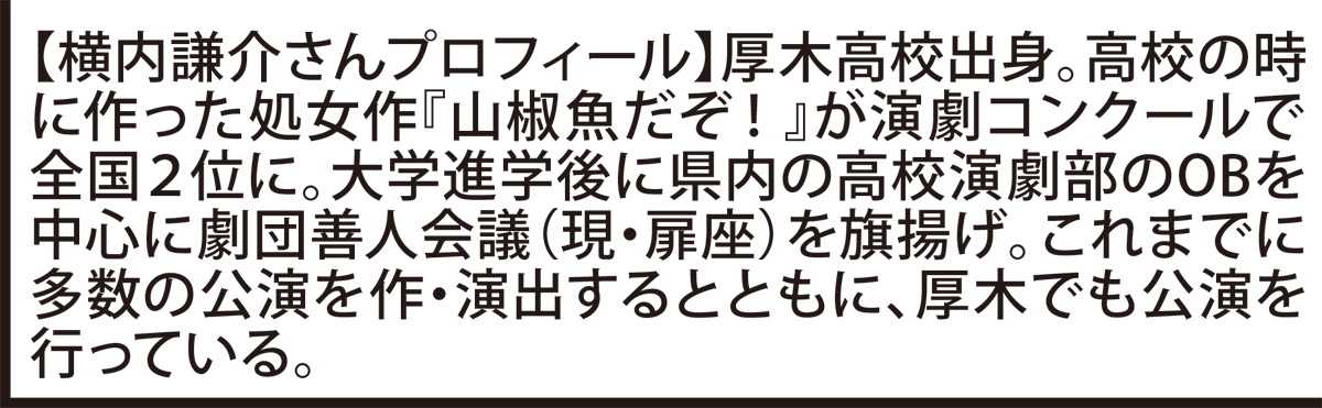 これからも、厚木に腰を据えて活動を展開するという横内さん。「厚木で全国から人を呼べる野外ライブをやりたい」という構想も温めている。そして、厚木で「育った」と言われる俳優をもっと増やしたいという。「厚木の人たちに喜んでもらえるように、もっと大きな仕事をして、名を売り、厚木で育ててもらった凱旋みたいなものをしっかりやりたい」と意気込む。