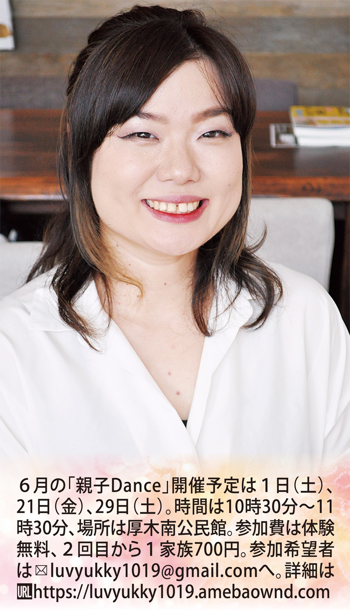 「産後の運動不足に、親子で踊って笑って悩みや疲れを発散しましょう」とパワーあふれる声色で呼び掛けるのは、未就学児向けダンスサークル「Mam☆Souls」の代表・楠田有希さん(厚木市三田)。保護者と子どもが一緒に楽しむ親子ダンスのほか、チアやヒップホップのサークルも主宰する。「親子ダンスは、ママが笑顔になるためのレッスンなんです。ママの笑顔で子どもも笑顔になります」。そう話す表情は活気に満ちて、周りに元気を与える。親子ダンスは、不定期で月3回ほど厚木南公民館やアミューあつぎなどで開催している。「参加者から『明るいレッスンが好き』と言ってもらって。私自身も楽しく、元気をもらっています」とにっこり。