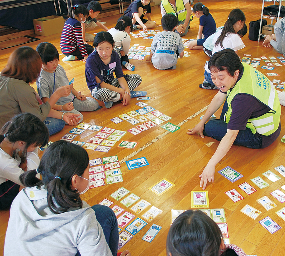 防災カードゲーム「なまずの学校」では、災害被災時の様々な場面で役に立つ身近な道具を考えた。「タンスの下に挟まっている人を助ける時に役に立つ道具は」の質問には、児童が「重い物を持った時も手がケガをしないように軍手が役に立つ」など、自分自身で防災について意見を出した。