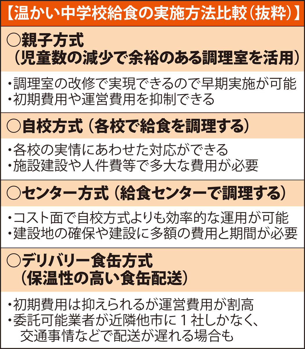 同計画案では、温かい中学校給食を提供する方法として、各校で調理する「自校方式」、給食センターで調理する「センター方式」、小学校で中学校給食を調理する「親子方式」、民間事業者の保温性に優れた食缶を使う「デリバリー食缶方式」の4種類を比較。初期費用や運営費用、児童数予測などを勘案し「本町においては親子方式による給食が最もふさわしい」と判断している。