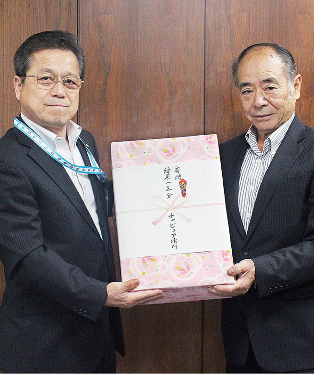 この日は、チャピュア清川運営委員会の城所明俊委員長が村役場を訪問し、岩澤吉美村長に緑茶を手渡した。村では今年3月から、村役場1階に無料給茶機を設置している。今後は、寄贈されたお茶を給茶機で使用し、清川茶の普及啓発や地場産品の発展に活用していくという。