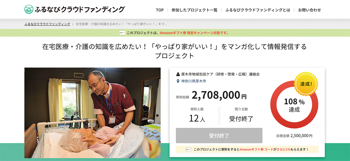 この朗読劇は人生の終盤、在宅の療養生活で起こるさまざまな出来事を架空人物の厚木花子さん(80歳)と夫の一郎さん(81歳)、その家族を通して描いたもの。医療関係者で構成される連絡会メンバーが、実際の現場で経験したエピソードが盛り込まれている。このシナリオには医療・介護に関する情報が多く含まれていることから、より広く普及啓発するため、マンガ化を計画。連絡会はボランティアで自主運営されており、活動資金がないため、同事業を担当する厚木市福祉総務課職員の発案で、ふるさと納税型クラウドファンディングを活用した。