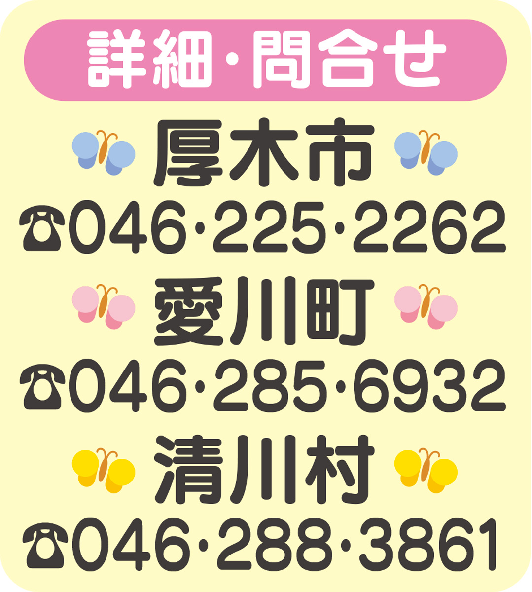 厚木市は、ちぐさ・厚木たちばな・厚木田園・厚木緑ヶ丘・はやし・厚木・厚木のぞみ・小鮎幼稚園の8園、愛川町は愛川幼稚園、清川村は清川幼稚園。無償化の対象は、3歳児から5歳児の全ての子ども。預かり保育の条件は、私学助成幼稚園と同様。該当園を利用している人で、保育の必要性がある場合は、無償化給付を受けるために、給付認定が必要。