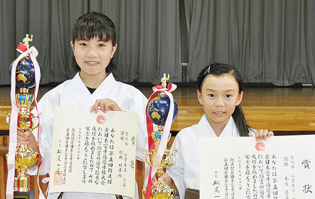 日本傳少林寺流空手道錬桜会湘北支部(浜辺秀典支部長)に所属する仁科好葉さん(愛川町立中津第二小5年)と本庄若菜さん(厚木市立荻野小4年)が、7月28日に東京都八王子市で行われた第5回防具付全日本空手道選手権大会の各部門で優勝した。