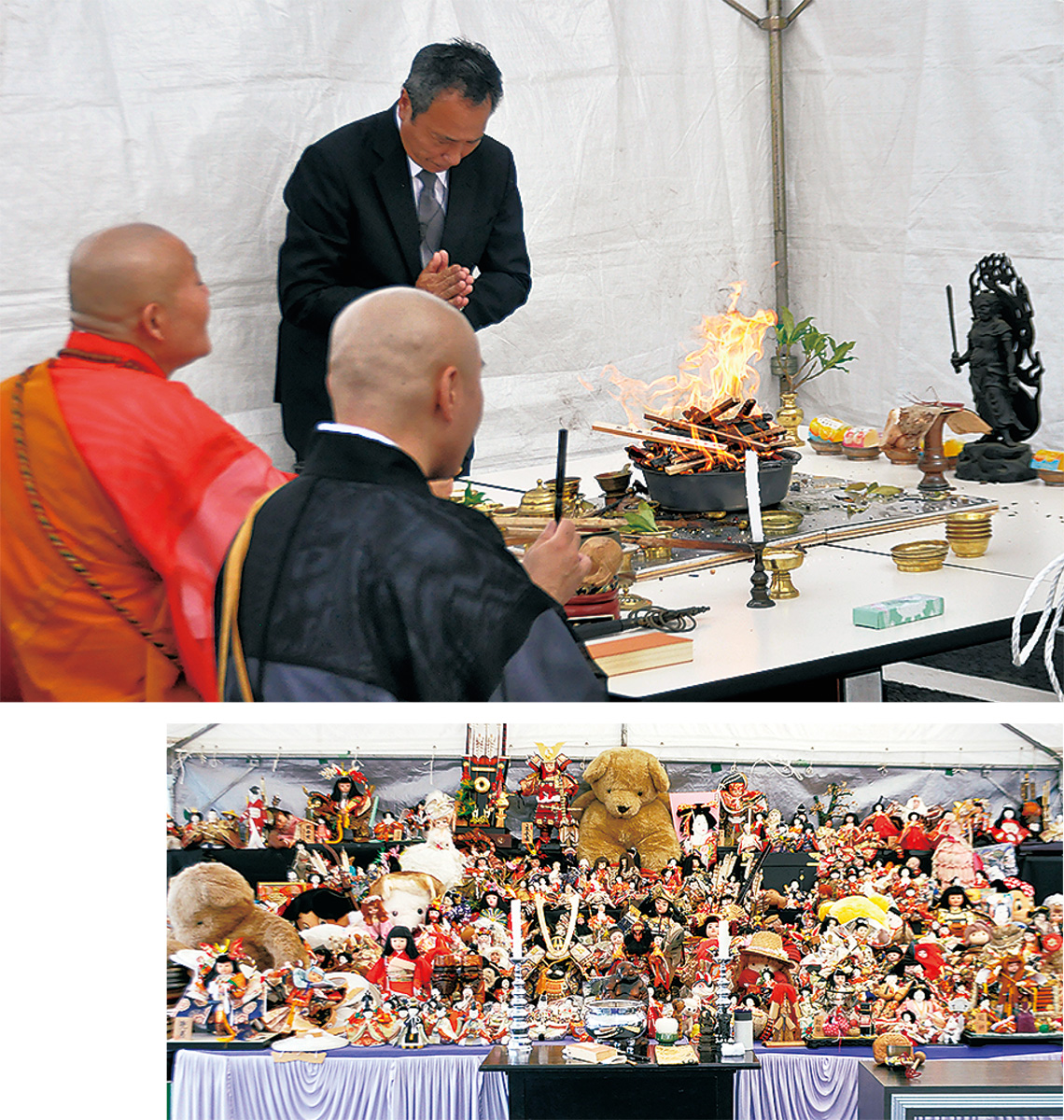 儀式文化の継承と、地域の役に立てるようにと毎年開催している同行事。当日は、「家内安全」「商売繁盛」などと書かれた護摩木の願いが成就するよう、お焚き上げが行われた。また、集められた多くの人形=写真下=は、伊勢原市の浄発願寺でお焚き上げ供養がされた。伊東利明社長は「地域の皆様のお役に立てるよう、今後も継続していきたい」と話した。