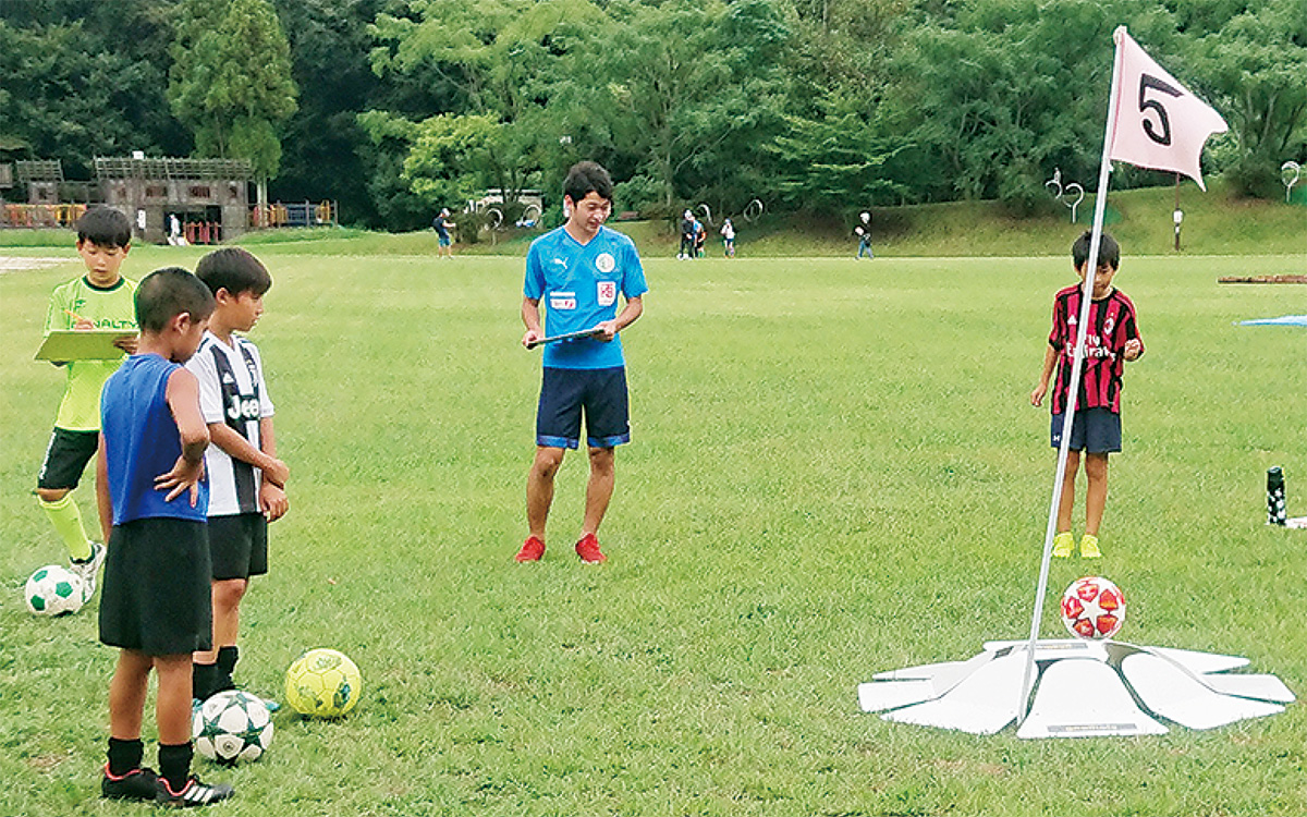 今大会には市内の小学生15人が参加。児童は、斜面を交えたコースや、丸太などの障害物のあるコースを攻略し、9ホールで蹴った回数を競った。優勝は、6アンダーの山田桂司君(5年/東町在住)。山田君は「フットゴルフは狙ったところにボールを止めるので、サッカーに活かせると思った」と感想を話した。