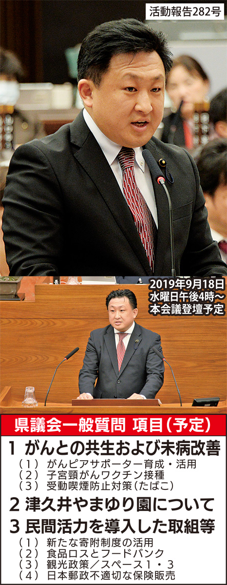 改選を経て無所属系の会派(県政会)に所属し初めてとなる本会議での質問となります。来週の水曜日午後4時から5時迄の予定での登壇です。