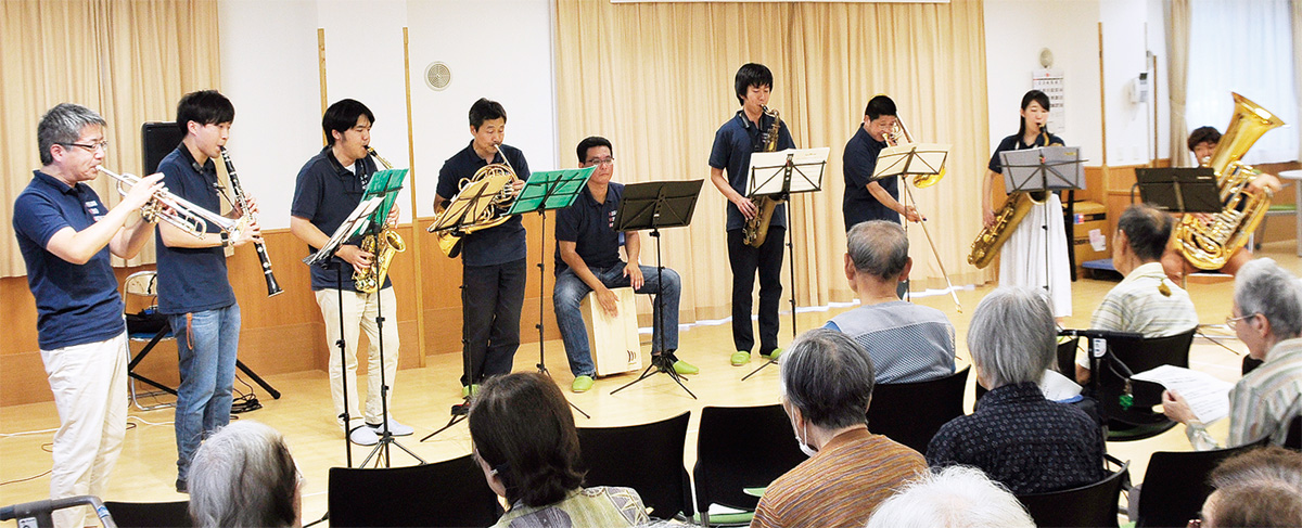 同所での演奏は約2年ぶりとあって、今回は団員が3つのアンサンブルに分かれて、3部構成で演奏を披露。金管、木管、サックスの3つのアンサンブルが、『浜辺の歌』『シャボン玉』『時代』『世界にひとつだけの花』などを迫力ある演奏で聴かせた。会場には施設利用者ら約50人が集まり、演奏ごとに多くの拍手が送られた。