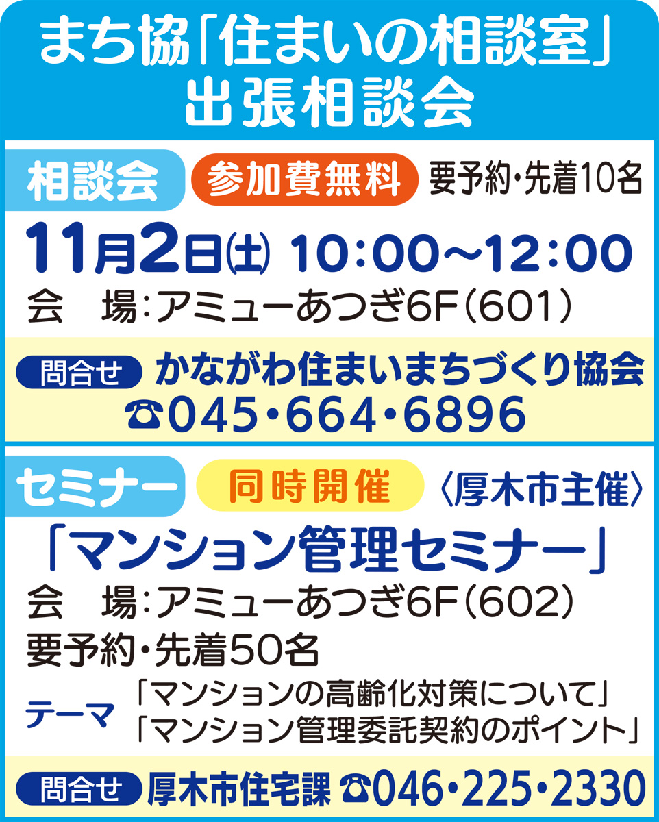 また、厚木市主催の「マンション管理セミナー」も同時開催。マンションの高齢化対策などが解説される。先着50人。問合せ・申込みは厚木市住宅課【電話】046・225・2330へ。